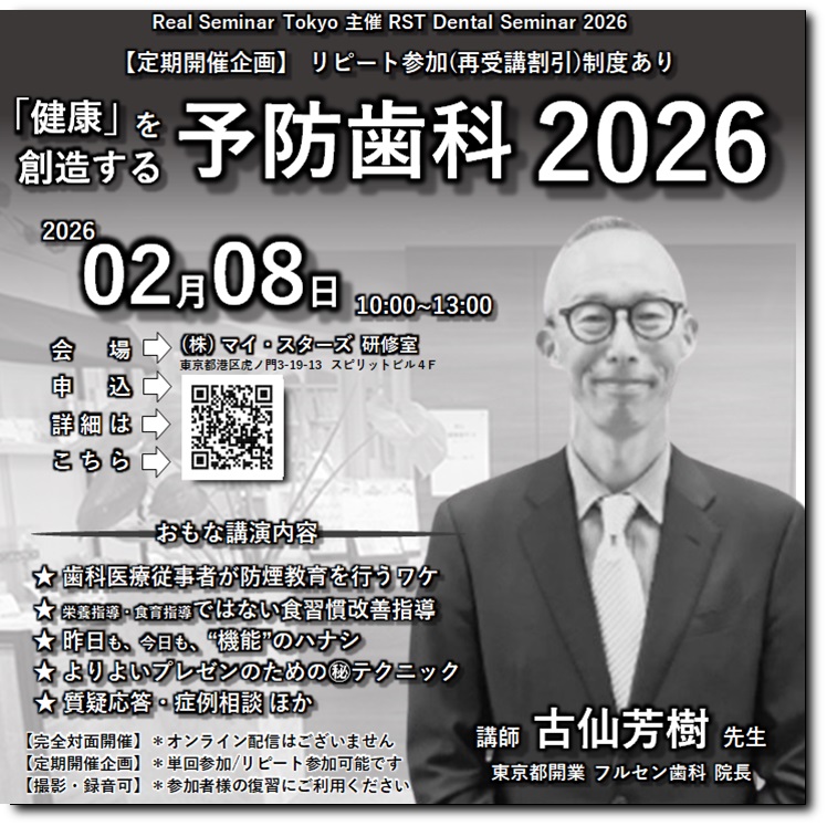 講師の古仙芳樹先生はご開業当時から予防・食育の大切さを四半世紀以上にわたり地域に情報配信し続けています その活動の過程で得たノウハウや「確実に相手に伝えるためのテクニック」等について本セミナーを通じて惜しみなく公開していただく予定です